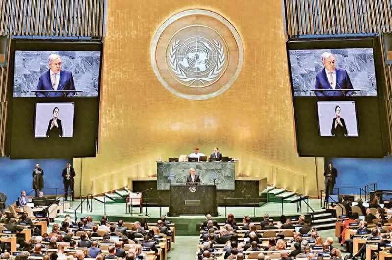 2024年9月22日至23日,联合国未来峰会在纽约联合国总部召开。峰会通过《未来契约》及其附件,以进一步发展多边主义框架,适应未来发展,努力建设一个安全、和平、公正、平等、包容、可持续和繁荣的世界。图为9月22日拍摄的峰会现场。新华社记者 李睿/摄